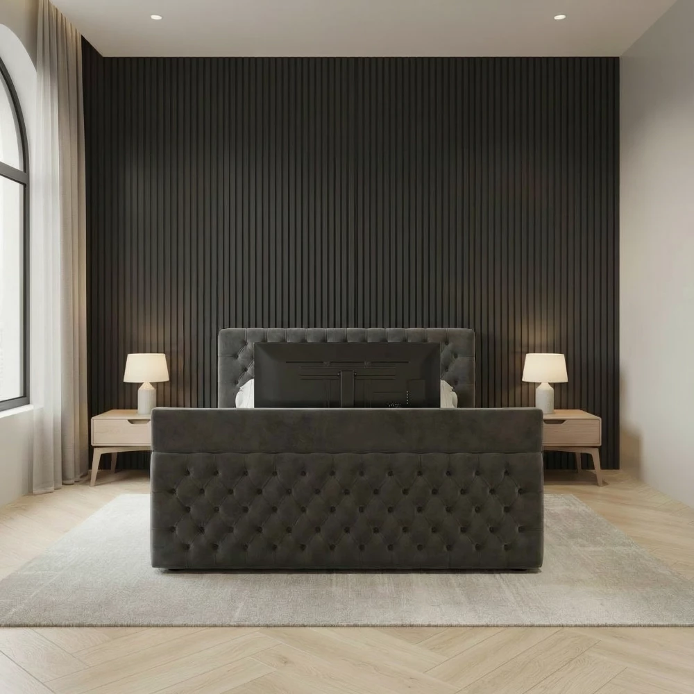 Technology Meets Comfort – Built-In TV Lift SystemFor the ultimate relaxation experience, The Chesterfield Royale TV Bed features an electric TV lift mechanism built neatly into the high footboard. With the touch of a remote, your TV rises smoothly into view — and disappears just as elegantly when not in use.