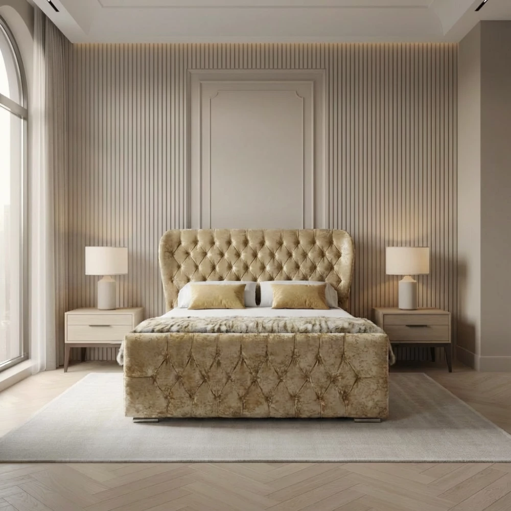 The Devonshire Velvet Bed – Luxury Bed FrameStep into a world of elegance and comfort with The Devonshire Velvet Bed, a beautifully handcrafted masterpiece that blends timeless sophistication with modern design. Created with exceptional attention to detail, this luxury bed frame reflects the finest in British craftsmanship.The Devonshire Velvet Bed features a striking butterfly-wingback headboard, deeply upholstered in a classic Chesterfield pattern. Its sculpted curves and rich detailing create an instant focal point, while the matching footboard completes the look with perfect balance and harmony.Premium Velvet Fabrics – Crushed or PlushPersonalise your Devonshire Velvet Bed with over 30 stunning colour choices and a selection of premium fabrics. Choose the shimmering texture of crushed velvet or the smooth softness of plush velvet to suit your personal style and bedroom décor. Each fabric option offers both visual richness and a luxurious tactile feel.Optional Ottoman StorageFor those who value both beauty and practicality, the Devonshire Velvet Bed can be upgraded with an Ottoman gas-lift storage system. This hidden storage solution provides ample room for bedding, clothing, and more, helping you maintain a tidy, clutter-free bedroom without compromising on style.Handcrafted QualityEvery Devonshire Velvet Bed is handmade in England, using traditional upholstery techniques and a solid wood frame for exceptional durability. Designed to stand the test of time, this bed isn’t just furniture—it’s a long-lasting statement of luxury and refinement.Transform your bedroom with The Devonshire Velvet Bed—a perfect blend of glamour, craftsmanship, and comfort, carefully created for those who appreciate the finer things in life.