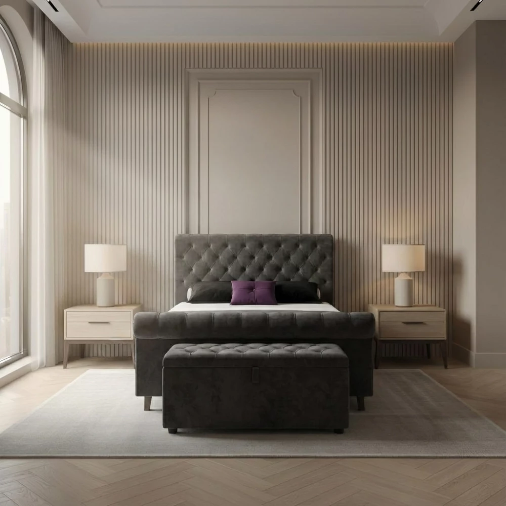 The Radcliffe Sleigh Bed – Upholstered Bed FrameExperience the refined elegance of The Radcliffe Sleigh Bed, a modern interpretation of the timeless English sleigh-bed design. Handcrafted by Britain’s trusted specialists in bespoke luxury beds for over a decade—this exquisite piece blends traditional charm with contemporary sophistication.Designed to make a statement in any stylish bedroom, The Radcliffe Sleigh Bed features the iconic scroll headboard and footboard, reimagined with today’s design trends in mind. Soft-touch chenille and shimmering crushed velvet fabrics enhance its luxurious profile, offering both comfort and visual indulgence.Over 30 Modern Colour OptionsChoose from a wide palette of colours to match your interior style. The Radcliffe Sleigh Bed is beautifully detailed with diamante studding, adding a subtle sparkle that elevates the entire look. Prefer something understated? Opt for matching fabric buttons for a more classic finish.Every detail has been thoughtfully crafted—from the upholstered side rails to the sleek chrome feet, giving the bed a polished, designer-standard appearance.Premium Craftsmanship for Long-Lasting ComfortBuilt on a solid wood frame, the Radcliffe Sleigh Bed promises exceptional durability and long-term performance. A system of robust wooden slats and a central support beam ensures your mattress receives the stability it needs for a comfortable, restful night’s sleep.Crushed Velvet or Chenille Sleigh BedWhether you lean towards the rich sheen of crushed velvet or the soft warmth of chenille, The Radcliffe Sleigh Bed offers a perfect balance of tradition, luxury, and contemporary style.The Radcliffe Sleigh Bed is more than just furniture—it's a lifestyle statement. Celebrate superior craftsmanship, modern elegance, and timeless design with a handcrafted bed that enhances the beauty and comfort of your home.